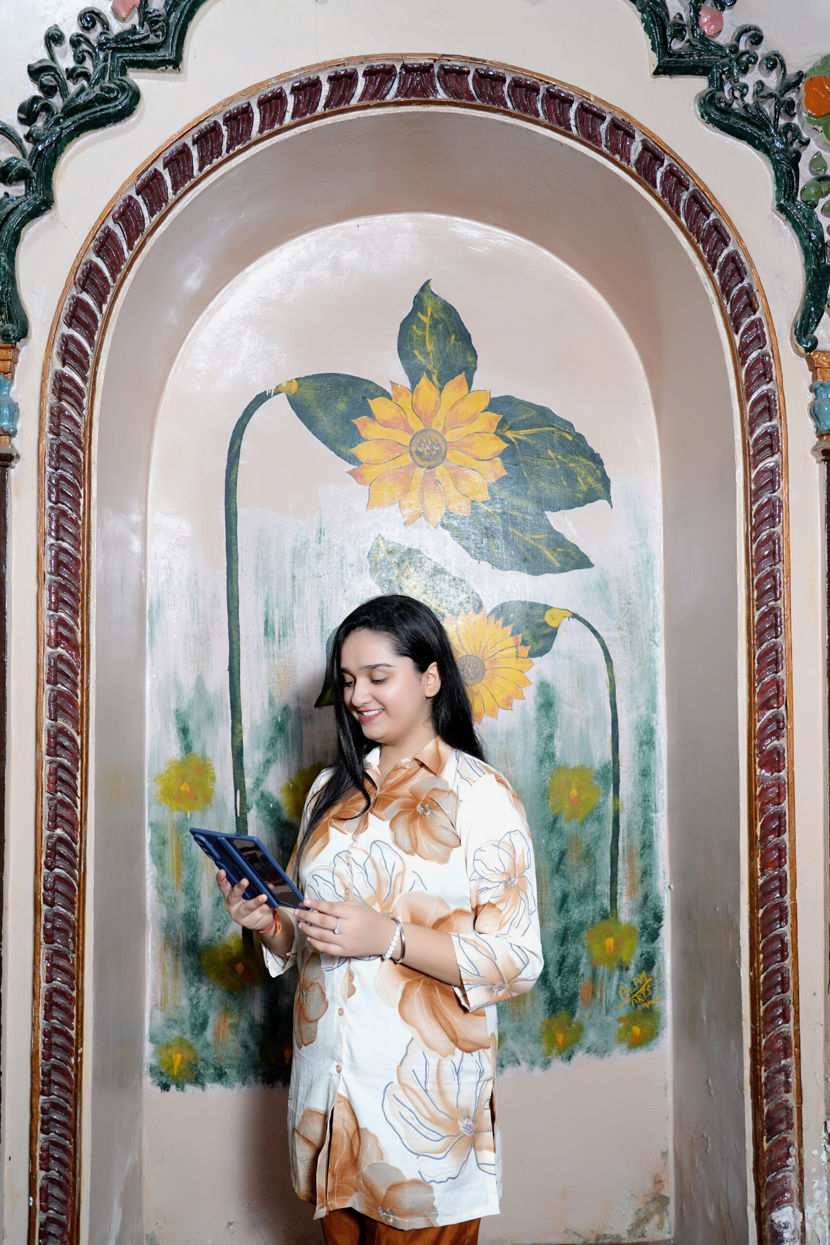 Elevate your everyday style with this beautiful short kurti featuring bold copper-toned floral prints on a crisp white base. The kurti’s front-button detailing adds a hint of structure and modernity, making it a versatile piece for both casual outings and semi-formal occasions.