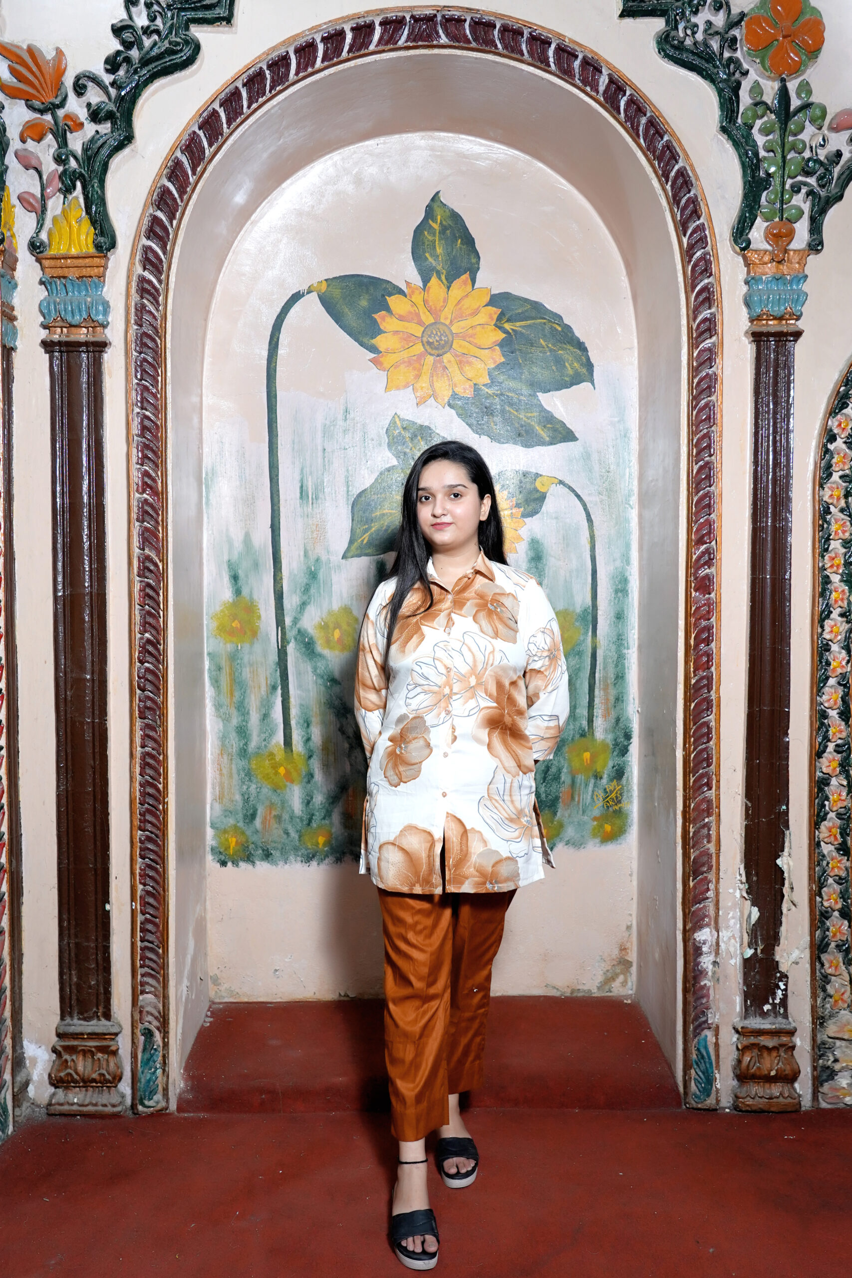 Modern simplicity meets floral elegance this white and copper short kurti set is a refreshing blend of comfort, charm, and style.